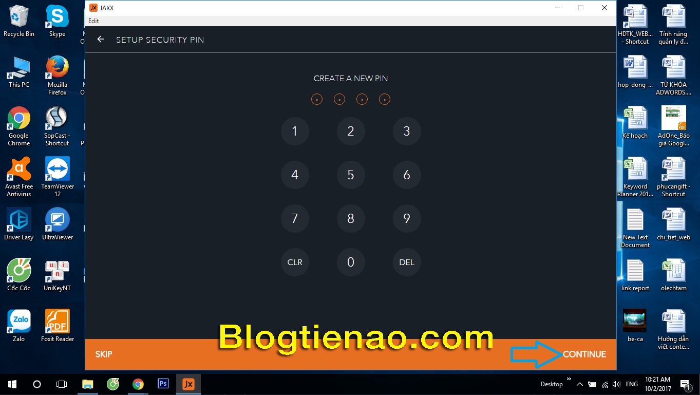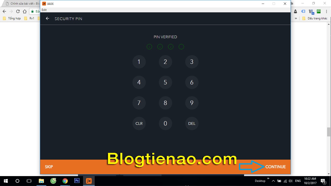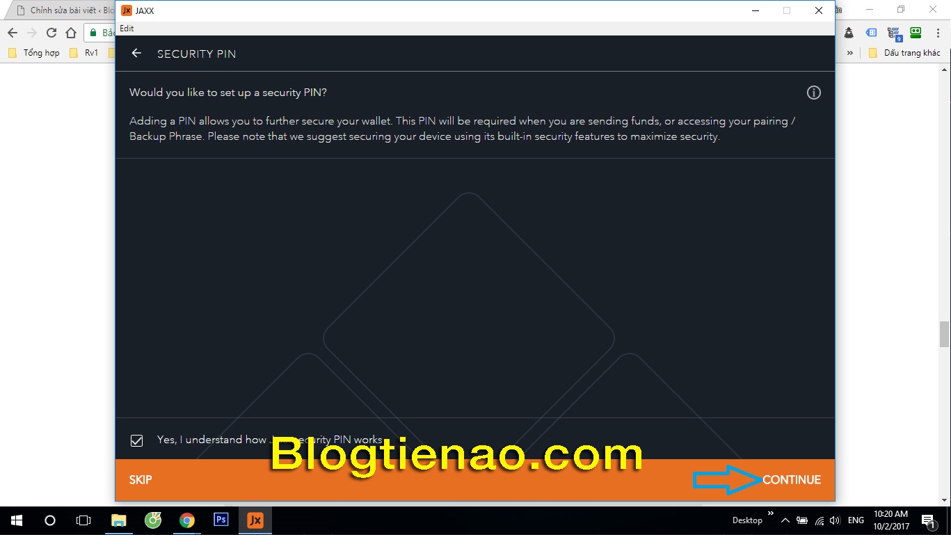 Bước 14: Bước này bạn sẽ thiết lập một mã PIN bảo mật cho ví Jaxx của mình, tích chọn “Yes, I understand how jaxx security PIN words” => “CONTINUE“.