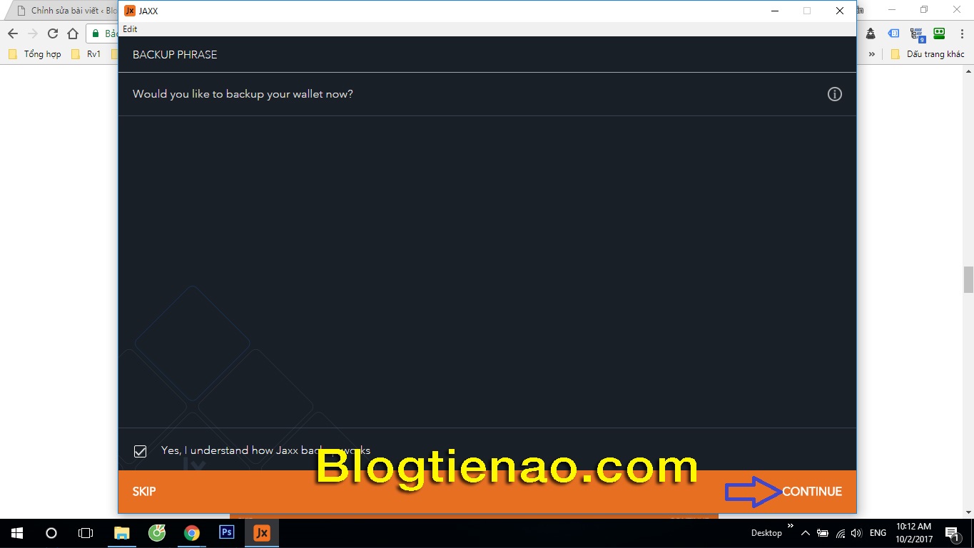Bước 11: Tạo một cụm từ sao lưu ví, cụm từ này do bạn tự đặt và dùng nó để sao lưu ví khi gặp sự cố hoặc muốn chuyển ví sang máy tính khác. Click chọn “Yes, I understand how jaxx backup words” => “CONTINUE“.