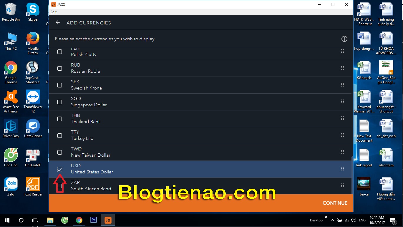 Bước 10: Chọn đơn vị tiền tệ mà bạn muốn chuyển đổi qua các coin (bước này tí nữa cũng có thể thay đổi được). Mình chọn USD