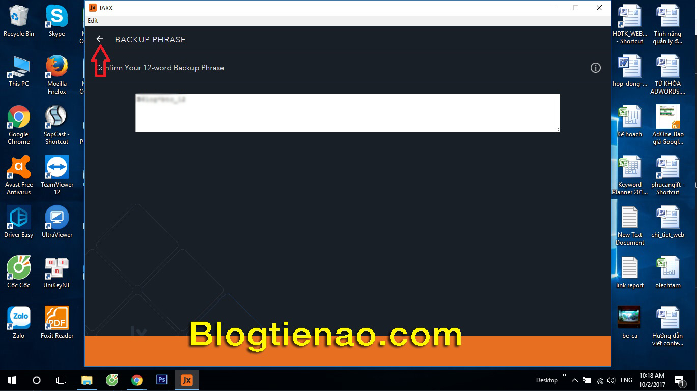 Bước 12: Bạn nhập vào ô màu trắng đúng “12 ký tự” bất kỳ (nên có chữ thường ,chữ hoa, số và ký tự đặc biệt, ví dụ: Blog#tien_12), sau đó lưu 12 ký tự này ra đâu đó cẩn thận không được để mất hoặc cho ai biết, rồi nhấn vào mũi tên “BACKUP PHRASE“.