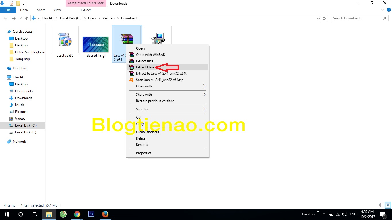 Bước 2: Bạn sẽ được đưa đến thư mục chứa file cài đặt .zip của Jaxx hình các cuốn sách như hình dưới, giờ bạn “nhấp chuột phải vào file” đó và chọn “Extract Here“.