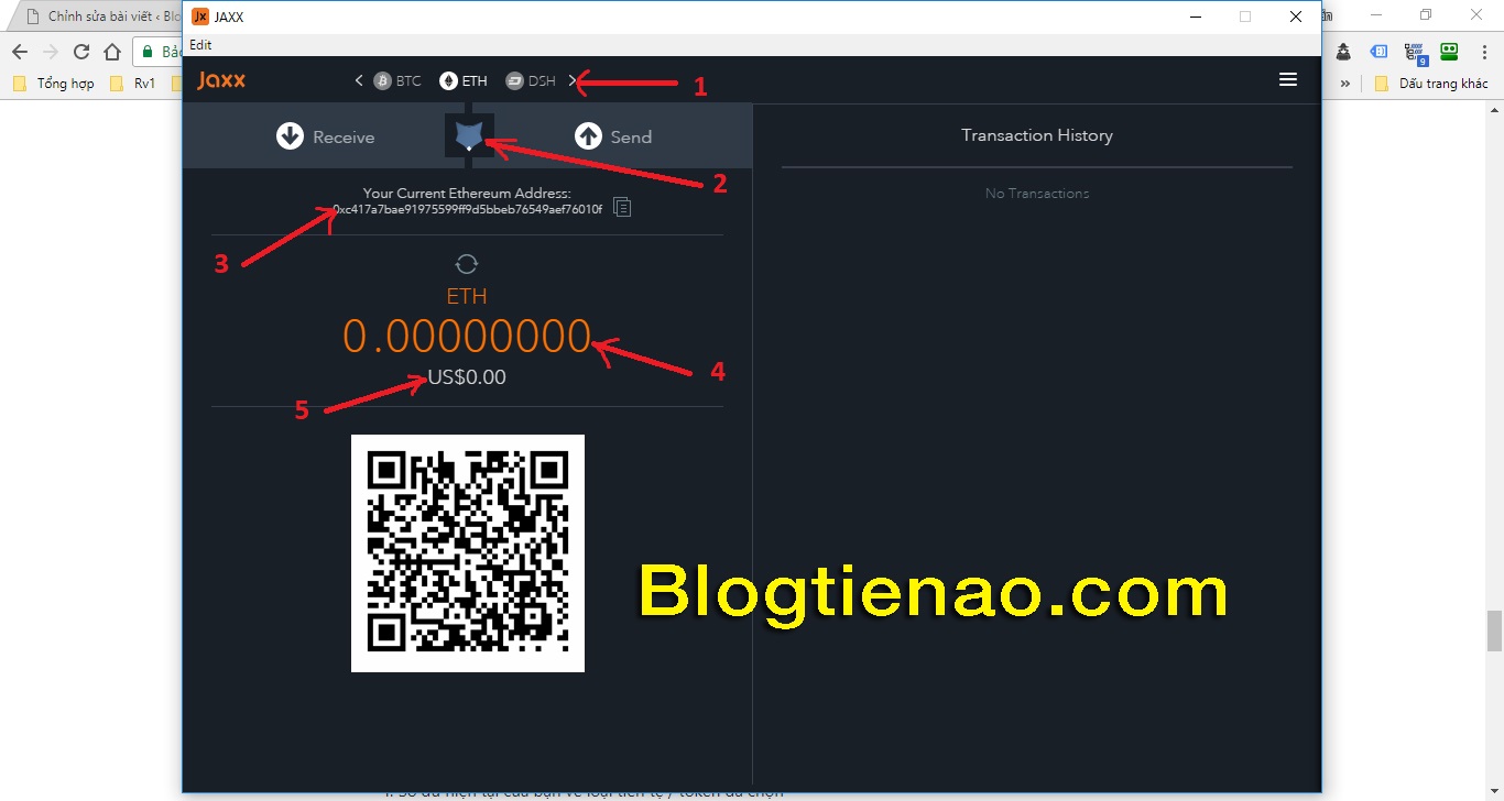 Sau khi tạo ví Jaxx xong giao diện của ví sẽ giống như hình dưới đây, có 5 thông tin cơ bản mình muốn bạn nắm được: