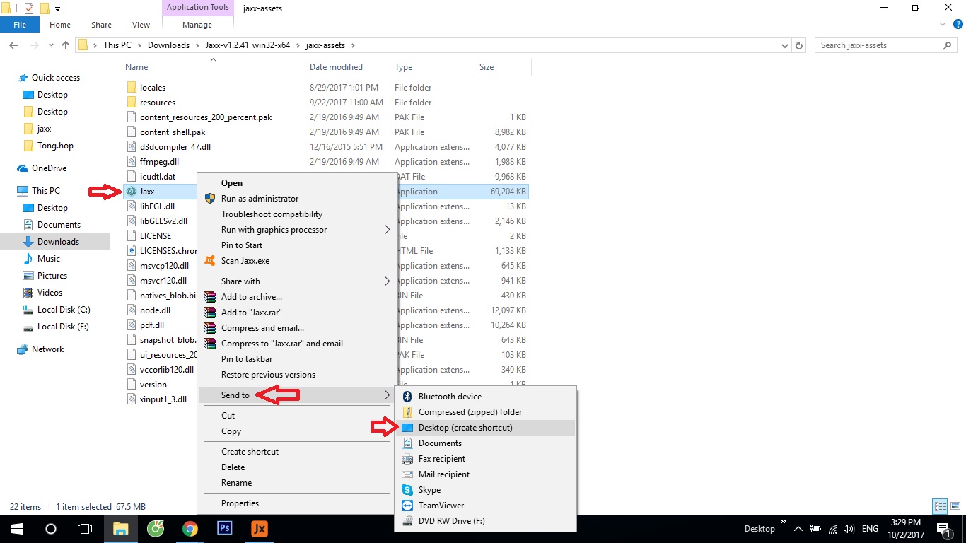 Bước 2: Click chuột phải vào icon “Jaxx” => di chuột xuống “Send to” => click chọn “Desktop (Create Shortcut)