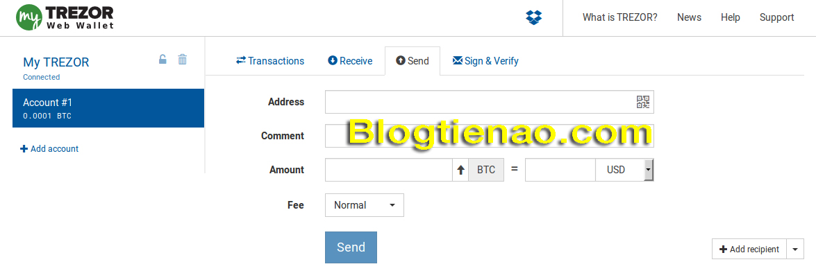 Bước 1: Để gửi Bitcoin cho người khác bạn chọn sang tab “Send” sẽ thấy giao diện như sau: