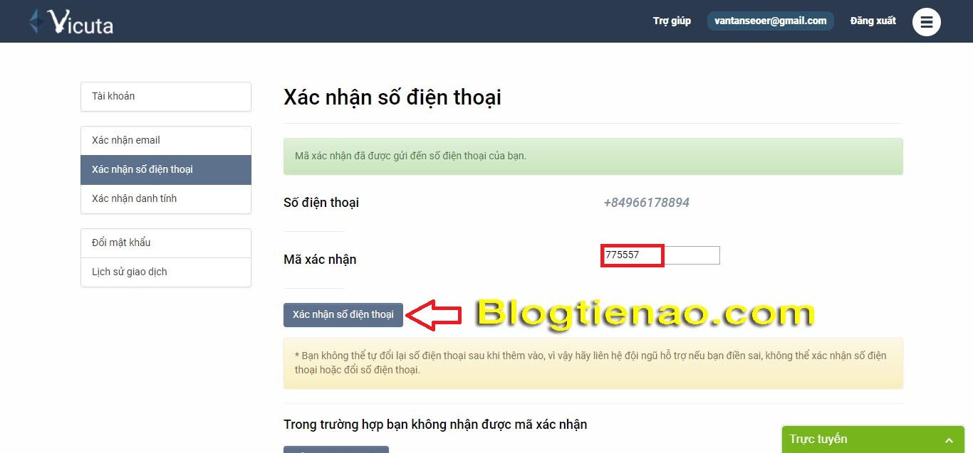 Bước 2: Ngay sau đó sàn giao dịch Vicuta.com sẽ gửi cho bạn một mã xác thực 6 số qua SMS, bạn nhập mã này vào ô “Mã xác nhận” và click vào “Xác nhận số điện thoại”.