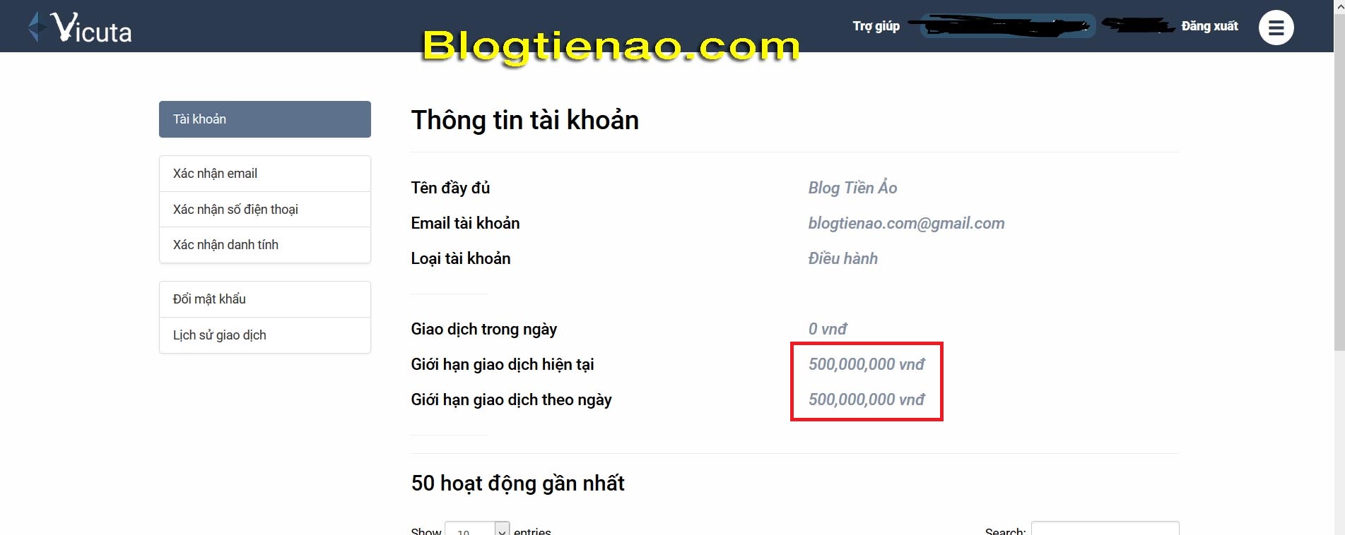 Bạn chờ vài phút để cho hệ thống của chợ Vicuta cập nhật, sau đó bạn vào “Tài khoản” sẽ thấy Hạn mức giao dịch hàng ngày tăng lên 500.000.000 VNĐ.