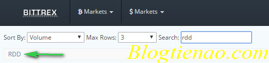 Bước 1: Bán altcoin cũng tương tự như lúc mua, bạn di chuyến đến mục Markets có biểu tượng BTC => Đánh tên altcoin muốn bán vào khu vực mua bán. Ở đây mình ví dụ với altcoin RDD (Reddcoin), là 1 đồng altcoin mình đã trữ từ lâu. (Các altcoin khác cũng tương tự nhé chỉ cần gõ ký hiệu vào là ok).