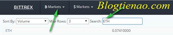 Bước 1: Trên trang chủ Bittrex bạn tìm đến mục “Market” có ký hiệu Bitcoin, trong mục search bạn điền đơn vị tiền tệ loại Altcoin bạn muốn mua (Chẳng hạn Ethereum có ký hiệu là ETH, tương tự các coin khác bạn có thể xem tại bảng Tỷ giá tiền ảo này nhé).