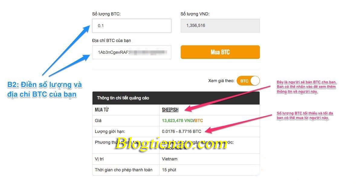 Nhập thông tin Bitcoin cần muaBước 3: Thanh toán cho người bán Bitcoin, bạn sẽ có 15 phút để chuyển tiền cho người bán theo thông tin mà Remitano đưa ra. Sau khi thanh toán xong, bạn nhấn vào nút “Tôi đã thanh toán”.