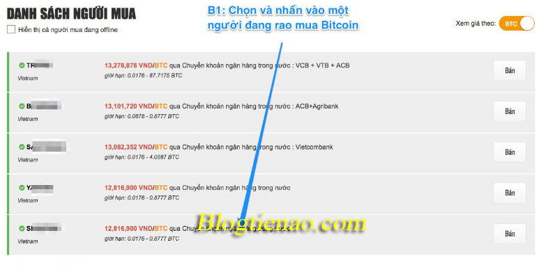 Bán BTC ra VNĐGiờ bạn ra trang chủ Remitano, có rất nhiều người đăng tin mua BTC. Vị trí trên cùng luôn mua giá đắt nhất, bạn bấm nút “Bán”.