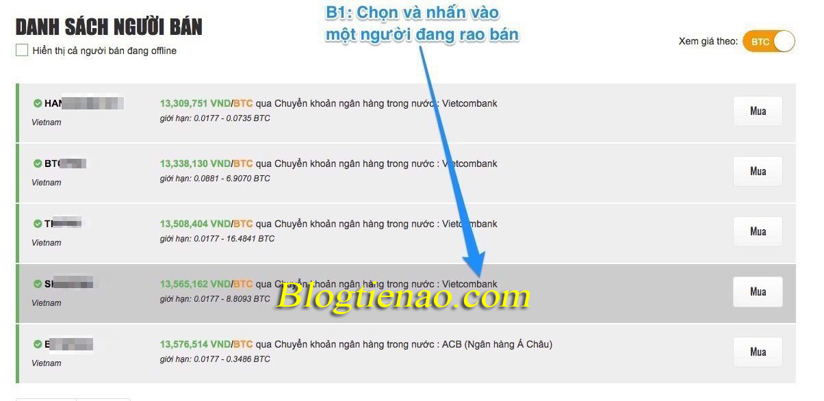 Bước 1: Đầu tiền bạn cần tạo một tài khoản trên sàn Remitano bạn có thể xem hướng dẫn chi tiết trong bài này nó khá đơn giản và nhanh chóng sau vài bước là bạn sẽ đăng ký thành công. Sau khi có tài khoản rồi trên trang chủ của Remitano bạn kéo xuống phần “Danh sách người bán”. Bạn nên chọn người đầu tiên trong danh sách này vì người rao bán Bitcoin có giá rẻ nhất sẽ được đứng top đầu. Để mua Bitcoin từ người nào đó bạn click vào “Mua”.