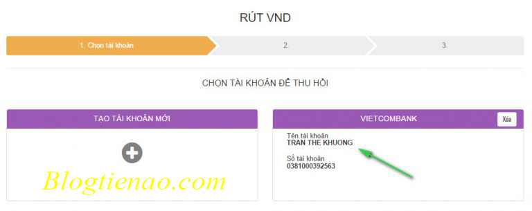 Khi bạn bấm Rút VNĐ như trên (Hoặc vào mục Ví VNĐ nhấn rút) thì sẽ được yêu cầu chọn tài khoản Vietcombank để rút, nếu bạn chưa add tài khoản VCB thì add vào: