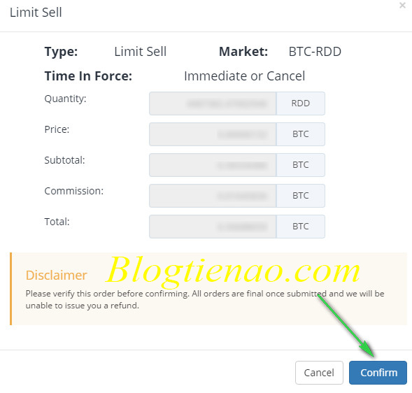 Chọn người mua AltcoinSau khi bấm vào, bạn sẽ xem và xác nhận lại yêu cầu bán, sau đó nhấn Confirm, ngay lập tức altcoin của bạn sẽ được bán và tài khoản Bittrex của bạn sẽ có số dư Bitcoin.