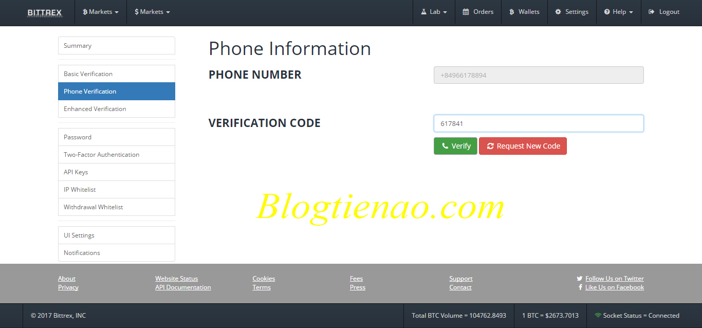 Bước 5: Xác nhận số điện thoại: Ngoài ra, bạn có thể làm thêm một bước xác nhận SĐT nữa để có thể sử dụng nhiều hơn tính năng trên sàn giao dịch Bittrex. Cũng trong mục “Setting” bạn chọn “Phone Verificatioin” , chọn cờ Việt Nam rồi nhập sđt của bạn vào (Nhớ nhập cả mã vùng +84 nhé).