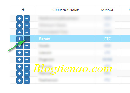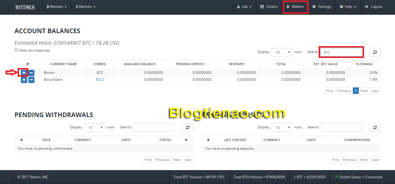 Tạo địa chỉ ví BittrexBước 2: Gõ tên “Bitcoin” hoặc ký hiệu “BTC” vào ô tìm kiếm mình khoanh tròn đỏ => Click vào dấu “+” trên dòng Bitcoin.