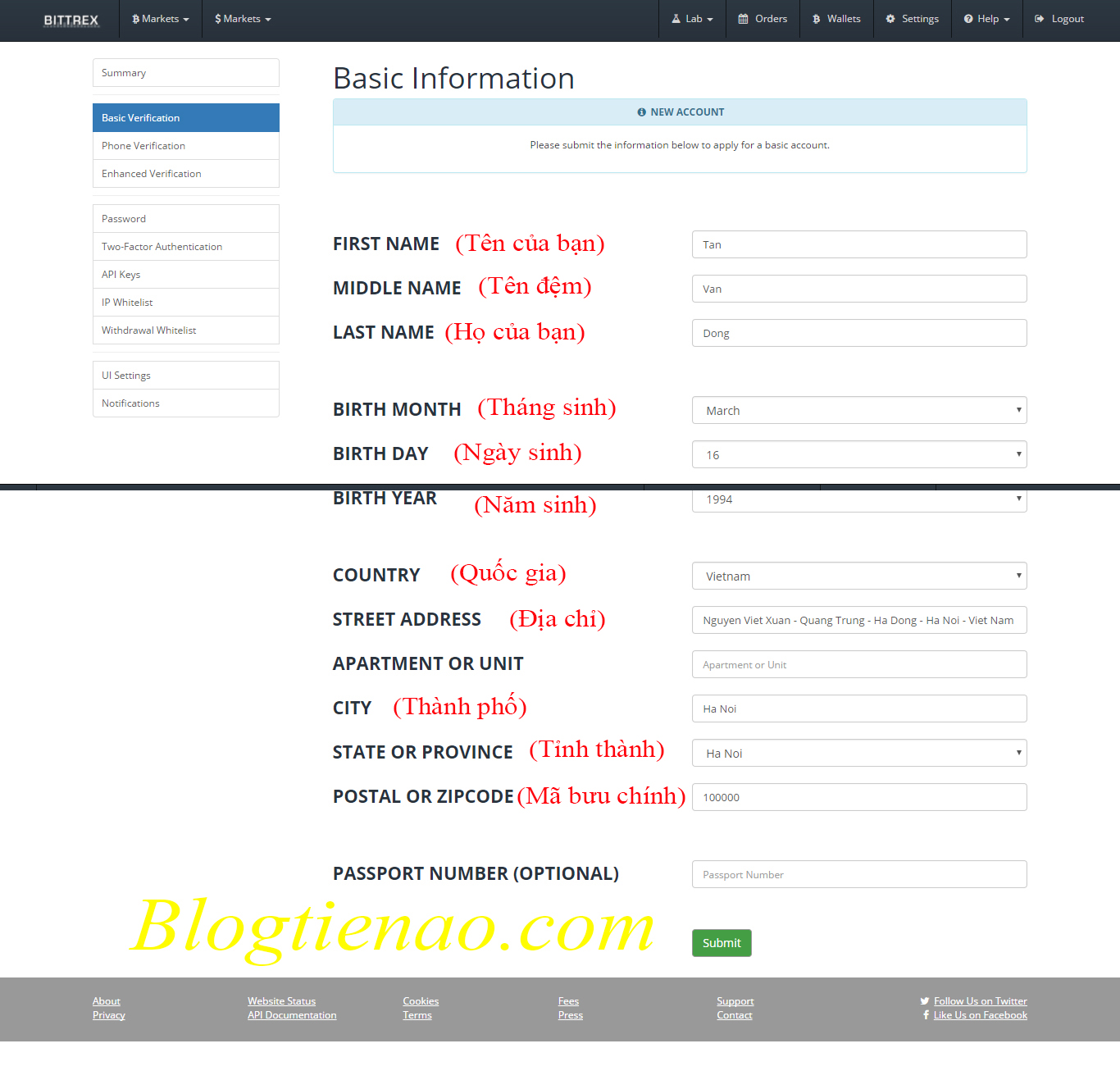 Nhập thông tin cơ bản trên BittrexTrong các mục trên thì Apartmaent và Passport nember là hai mục không bắt buộc bạn có thể bỏ qua, Mã bưu chính của Hà Nội là 100000 và TPHCM là 700000 còn các tỉnh thành khác bạn tìm trên google nhé. Nhập đầy đủ sau đó nhấn “Submit” để hoàn thành. Nếu bạn muốn tăng thêm mức tiền được rút mỗi lần lên 50.000 USD thì có thể làm tiếp tục mục Enhanced Verificatioin. Xem hướng dẫn bài viết dưới: