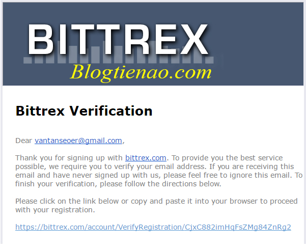 Đăng ký tài khoản trên sàn BittrexBước 2: Hệ thống của Bittrex sẽ gửi cho bạn một Email xác nhận đăng ký, bạn vào hộp thư đến email đã nhập và click vào Link để Verifi như dưới hình.