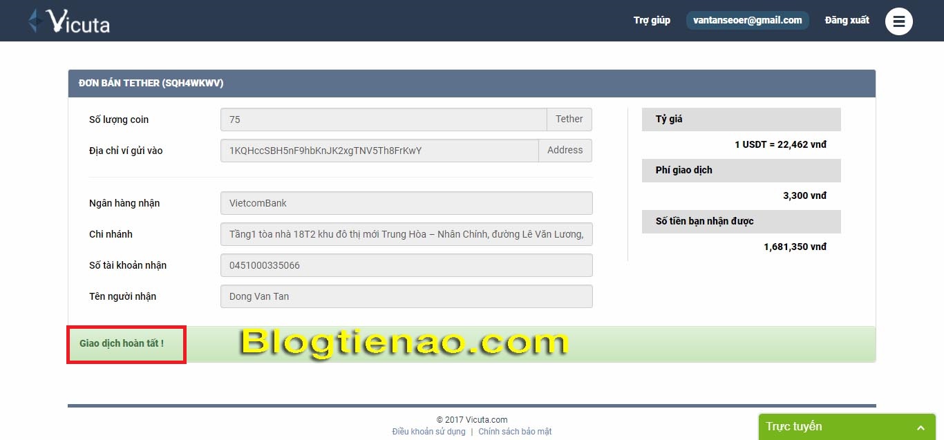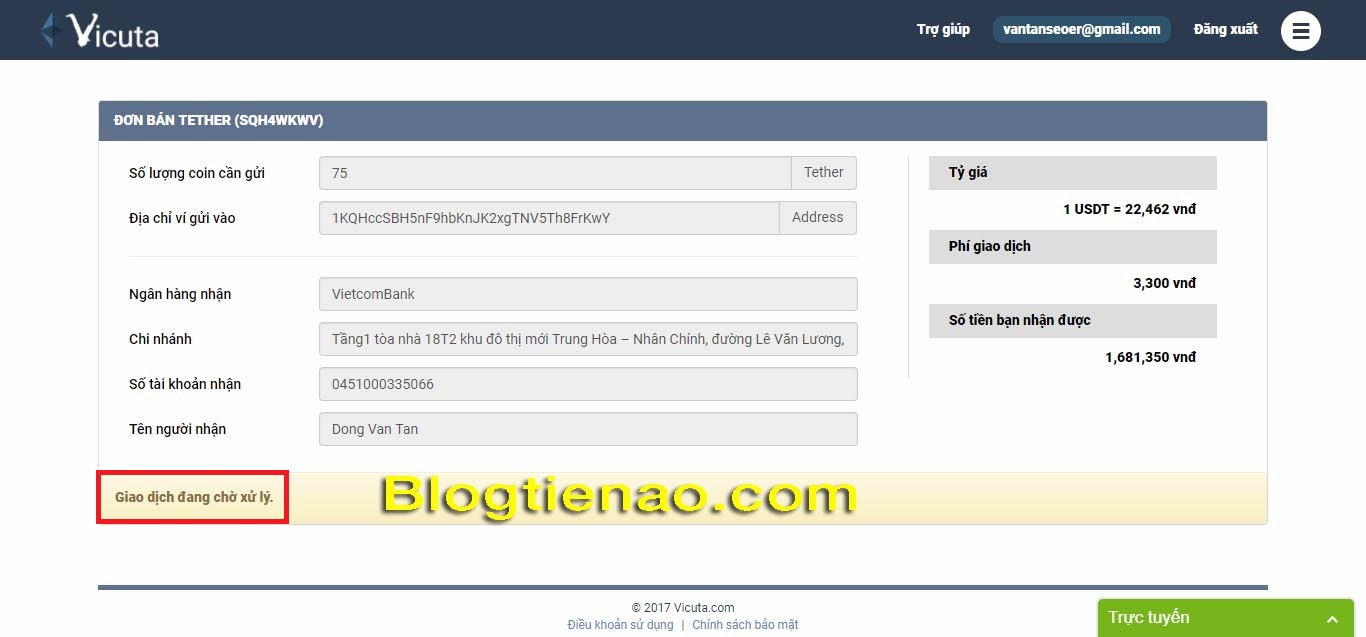 Bây giờ bạn cần chờ xác nhận giao dịch tầm 30 phút – 1 giờ, khi nào Vicuta nhận được số USDT của bạn thì họ sẽ chuyển số tiền 1,681,350 vnđ vào tài khoản ngân hàng bạn đã cung cấp. Và khi đó giao dịch của bạn sẽ hoàn tất như dưới hình.