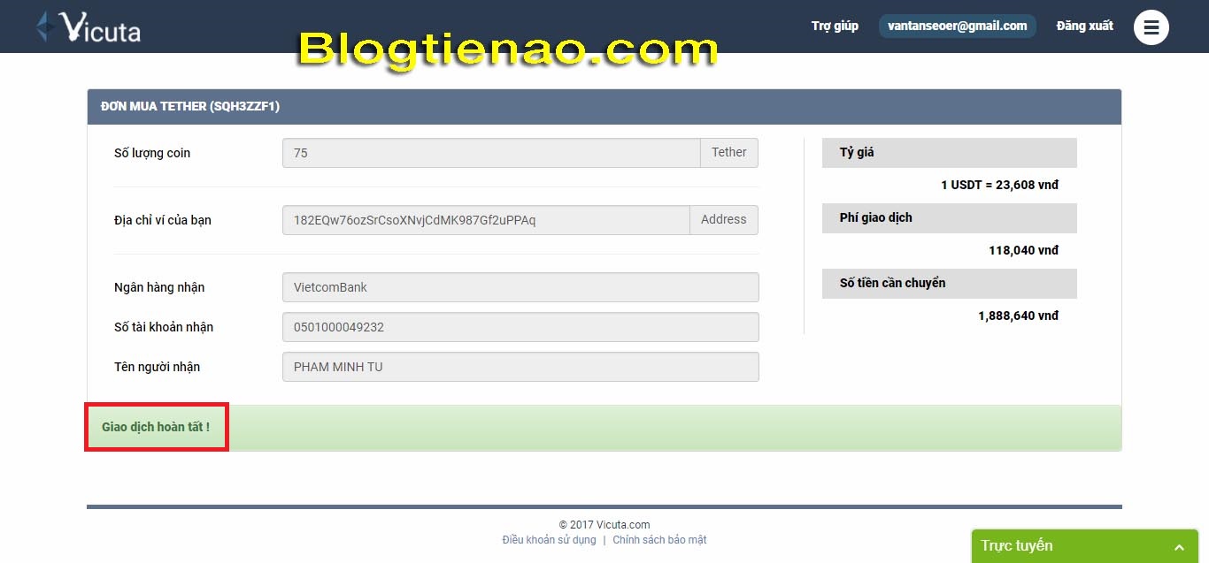 Ngay sau đó sàn Vicuta sẽ thông báo “Giao dịch hoàn tất“, giờ bạn cần chờ giao dịch của bạn được xác nhận, mất tầm 30 phút thì số USDT bạn mua sẽ vào ví USDT của bạn.