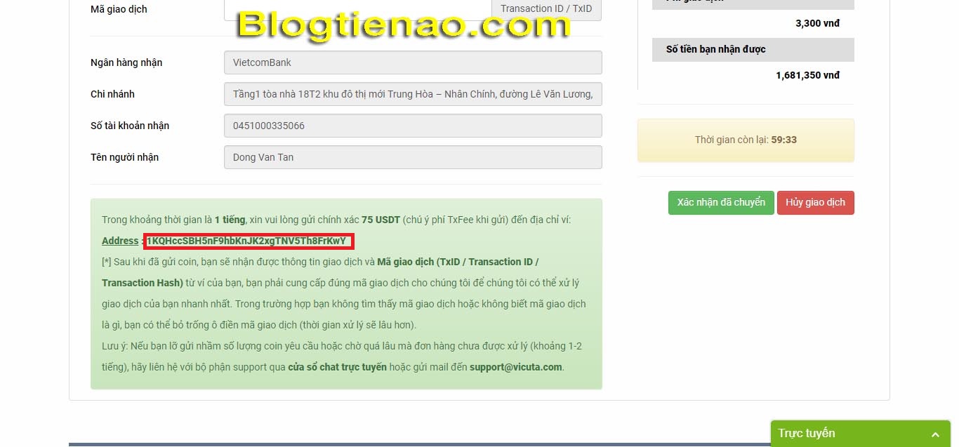 Nếu trường hợp đợi lâu mà giao dịch vẫn chưa được xử lý hoặc găp bất cứ khó khăn gì trong quá trình thực hiện mua bán coin thì bạn có thể inbox cho nhân viên hỗ trợ của sàn Vicuta bằng cách click vào khung chát màu xanh “Trực tuyến” góc màn hình dưới bên phải nhé.
