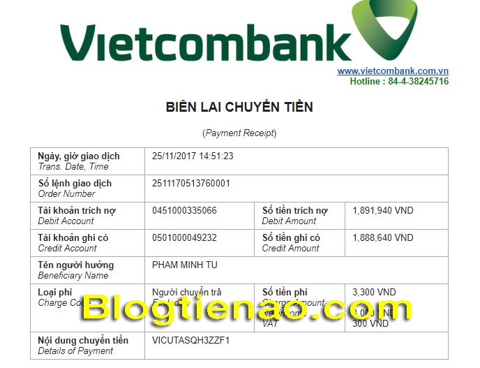 Bước 4: Sau khi chuyển khoản thành công tới tài khoản ngân hàng mà Vicuta cung cấp, thường Ngân hàng họ sẽ gửi cho bạn một Email thông báo giao dịch thành công, trong đó chứa một tờ biên lai, bạn nên chụp ảnh lại biên lai đó, phòng trường hợp giao dịch lỗi hay sự cố ngoài ý muốn thì sẽ dùng làm bằng chứng để khiếu nại với Vicuta.