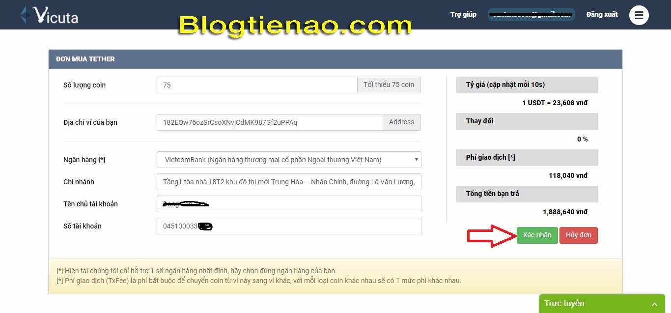 Bước 5: Bây giờ bạn quay lại Vicuta và click vào “Xác nhận giao dịch” để hoàn tất.