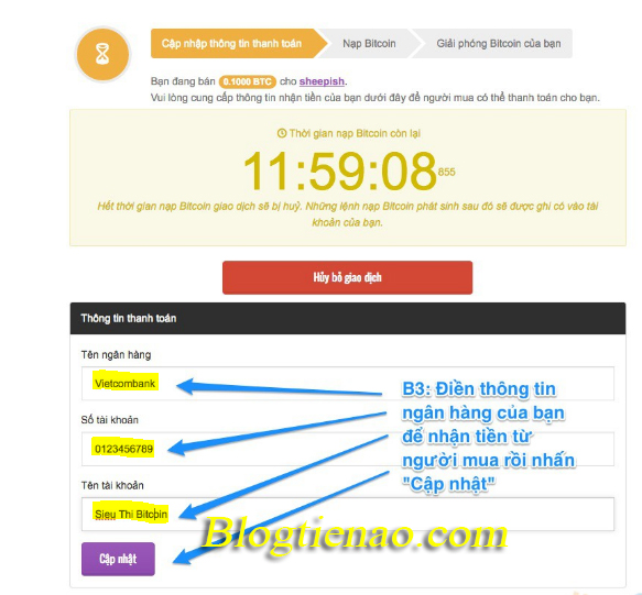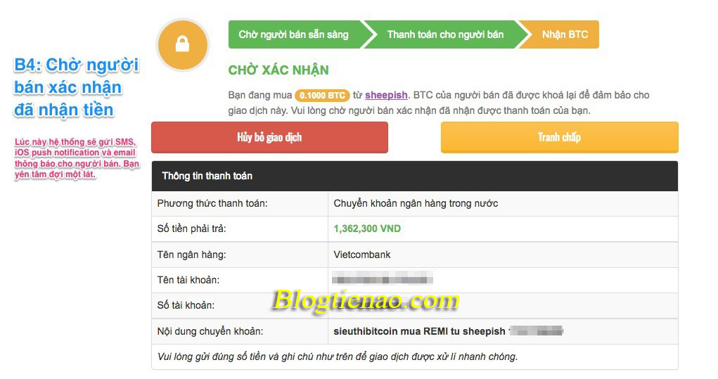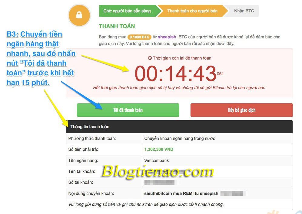 Nhập vào số lượng Bitcoin mà bạn muốn muaBước 3: Thanh toán cho người bán Bitcoin. Bạn có 15 phút để chuyển tiền cho người bán theo thông tin mà chợ Bitcoin Remitano cung cấp. Sau khi thanh toán xong, bạn nhấn vào nút “Tôi đã thanh toán”. Lúc này Remitano sẽ khóa số BTC của người bán lại để chờ bán cho bạn.