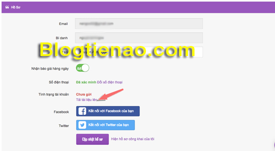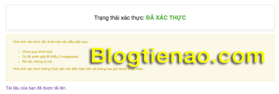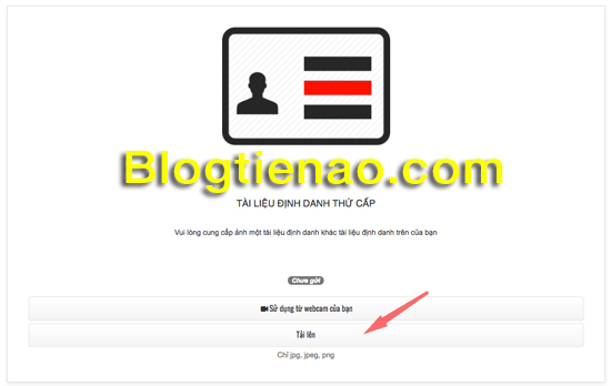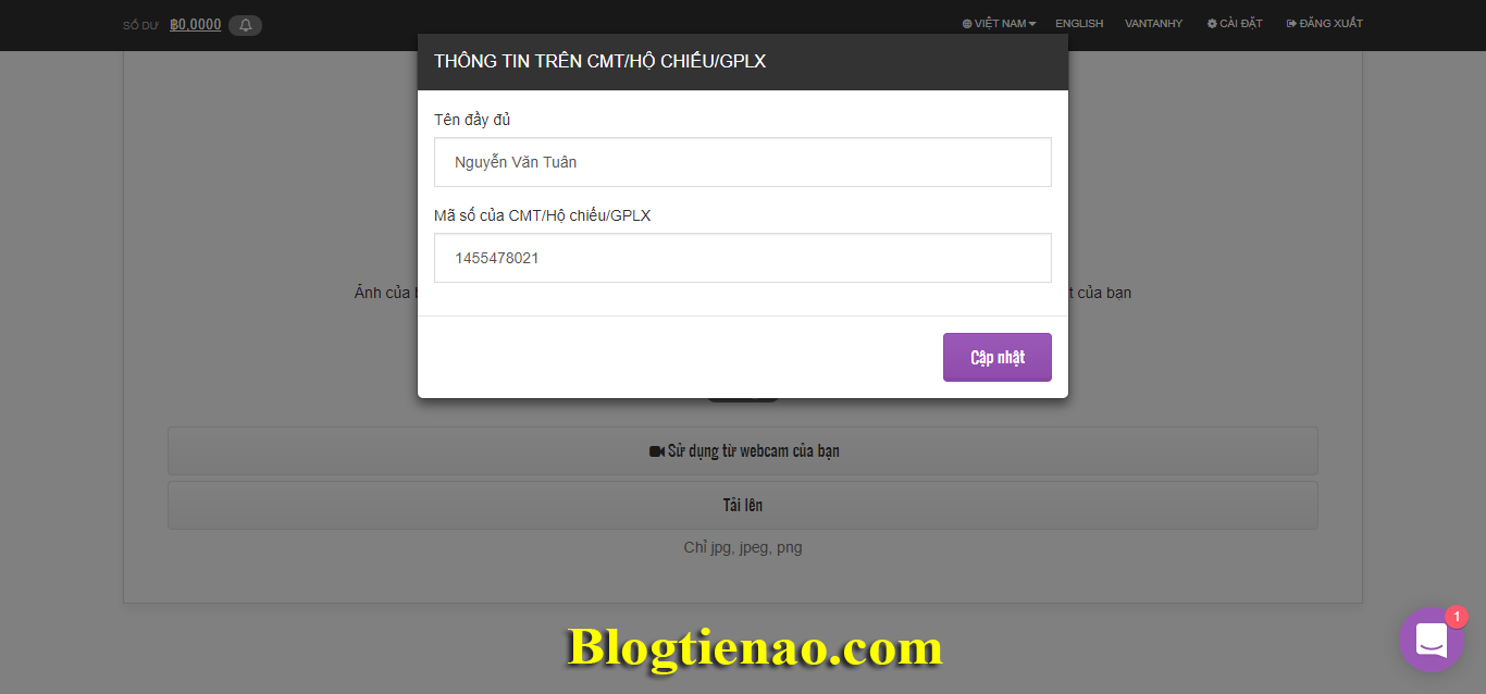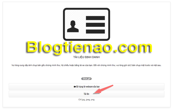 Tài liệu định danh CMND– Bạn nhập vào tên đầy đủ giống trong CMND và số CMND của bạn rồi nhấn “Cập nhật“. sau khi tải lên thành công hệ thống sẽ tự động chuyển sang bước tải tiếp theo.