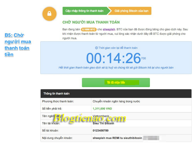 Bước 5: Chờ người mua Bitcoin thanh toán tiền cho bạn. Sau khi nhận được thanh toán từ người mua (Bạn nên kiểm tra chắc chắn có đúng người mua đã chuyển đến hay chưa) vào tài khoản của ngân hàng, bạn mới chọn nút xác nhân “Tôi đã nhận tiền”.