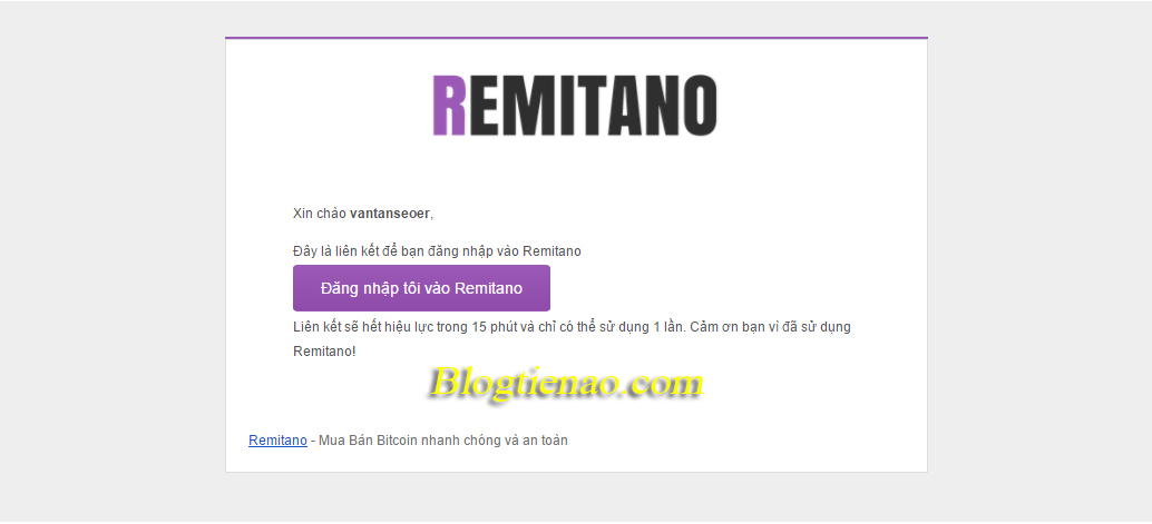 Đăng ký tài khoản chợ bitcoin RemitanoBước 2: Xác thực tài khoản Remitano: Hệ thống của sàn Remitano sẽ gửi cho bạn một Email để kích hoạt tài khoản, bạn vào hộp thư đến và click vào “Đăng nhập tôi vào Remitano”.