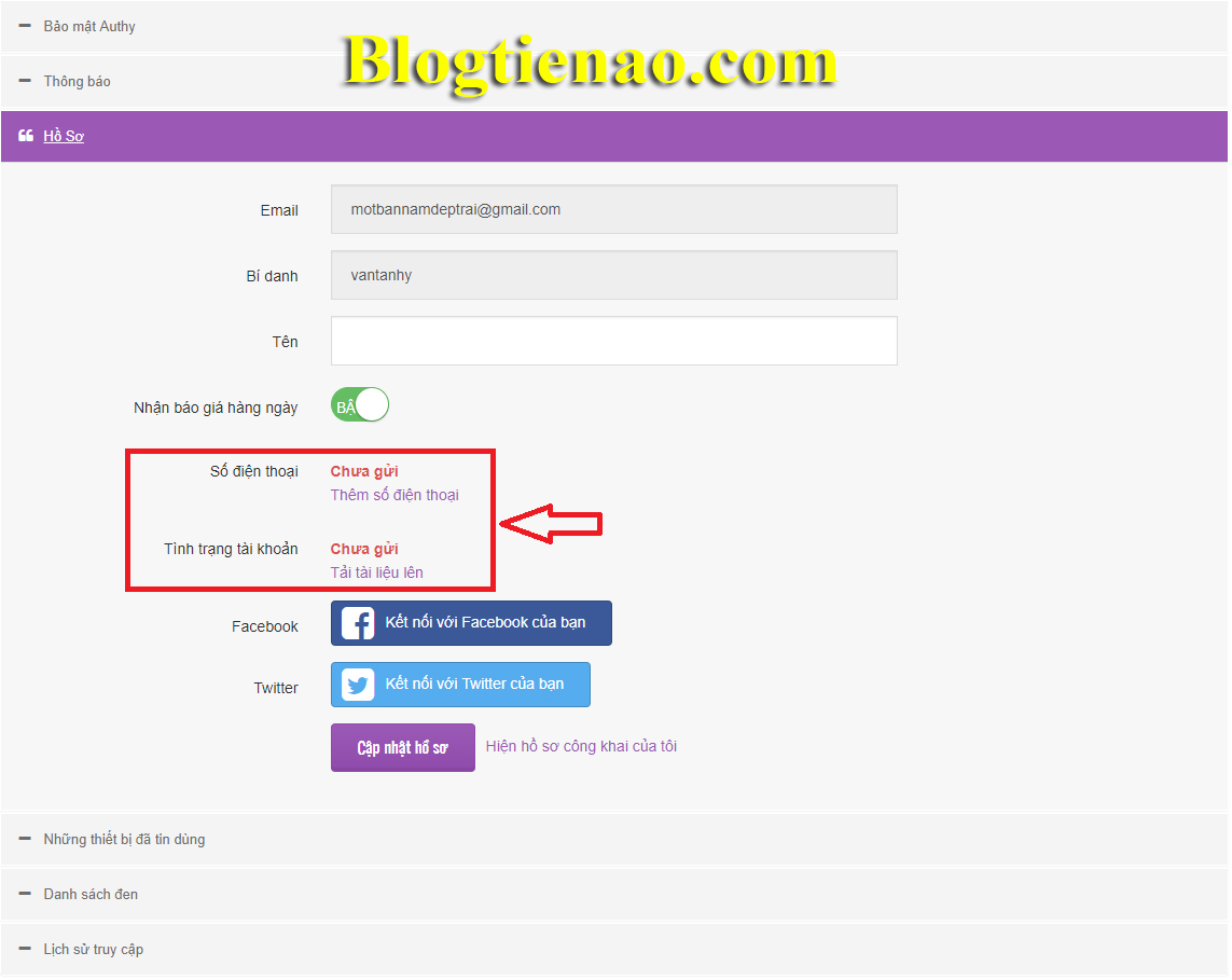 Xác minh sđt trên RemitanoBước 2: Kéo xuống click vào mục “Hồ sơ“, ở đây bạn sẽ thấy có 2 mục là “số điện thoại” và “tình trạng tài khoản” là “chưa gửi“. Đầu tiên bạn click vào “Thêm số điện thoại“.