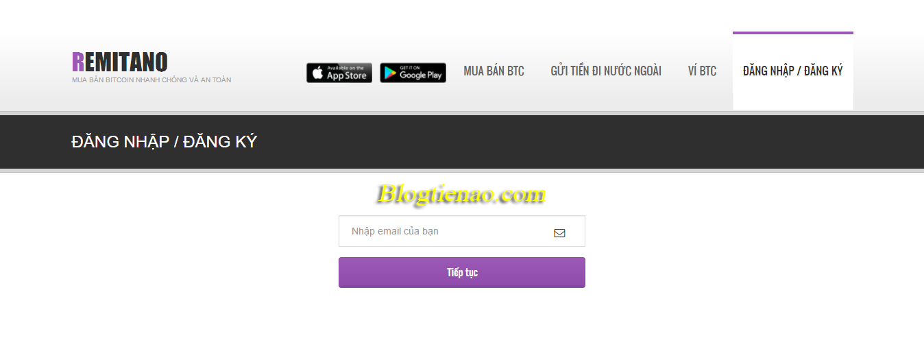 Bước 1: Bạn truy cập vào link này https://remitano.com/vn/login để tiến hành tạo tài khoản mới trên Remitano. Bạn nhập Email vào ô dưới và nhấn “Tiếp tục”.