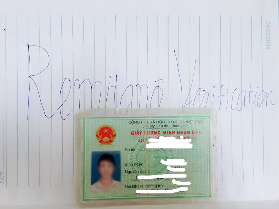 Ảnh tự sướng cầm CMNDẢnh 3: Tiếp đến là ảnh chụp CMND đặt trên tờ giấy trắng có chữ “Remitano Verification”: