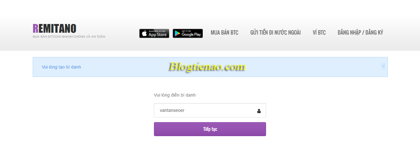 Kích hoạt tài khoản để đăng nhập vào Remitano vnSau đó bạn nhập bí danh hay tên của bạn vào nhé, ở đây mình lấy ví dụ “vantanseoer”.