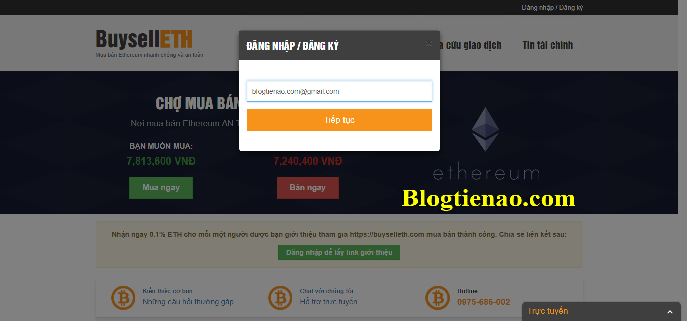 Bước 1: Đầu tiên bạn truy cập vào đây https://buyselleth.com/ rồi click vào phân “Đăng nhập/Đăng ký” sau đó điền Email của bạn vào, nhấn “Tiếp tục”.