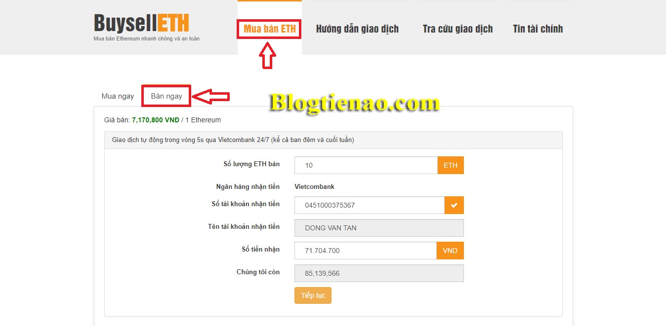 Tương tự như khi mua Ethereum bạn vào mục “Mua bán ETH”, chọn tab “Bán ngay”, rồi điền vào thông tin mua bán: