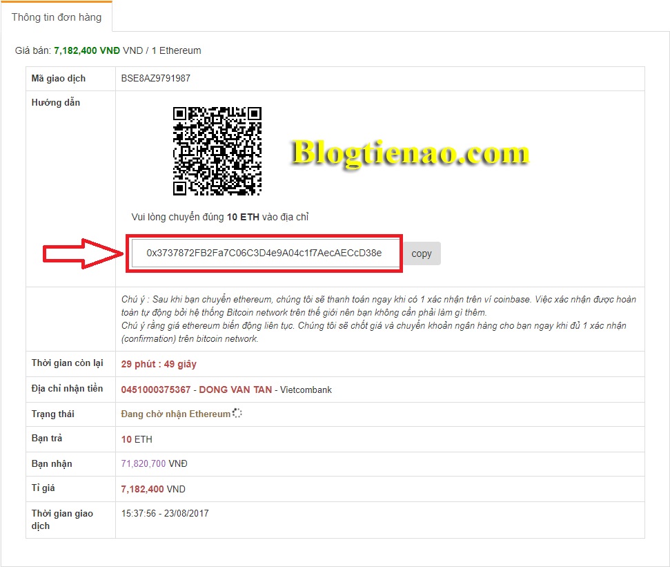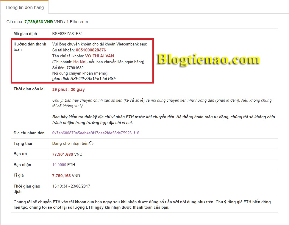 Khi chưa chuyển khoản, hệ thống sẽ báo Trạng thái là “Đang chờ nhận tiền”. Sau khi chuyển khoản thành công bạn đợi khoảng 15 giây, hệ thống xử lý xong sẽ chuyển sang trạng thái “Hoàn thành”, tức là giao dịch đã thành công, BuysellETH đã gửi số ETH mà bạn mua vào ví ETH của bạn. Tùy thuộc vào ví Ethereum của bạn ở đâu mà thời gian tới sẽ lâu hay nhanh.