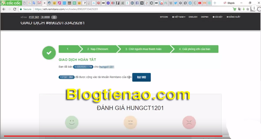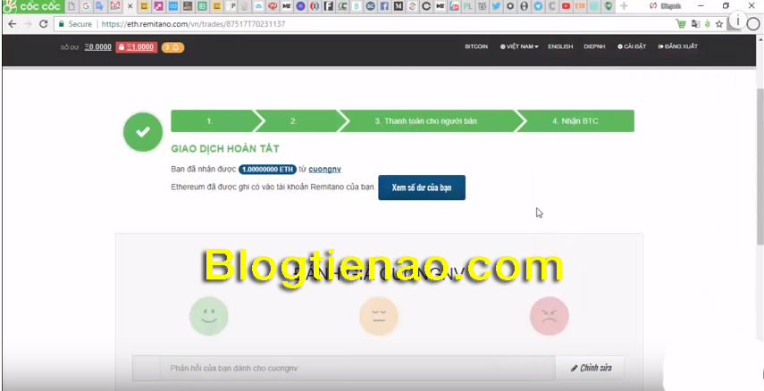 Trên đây là cách mua bán Ethereum nhanh tức là Remitano.com sẽ tự động chọn người mua và bán cho mình theo số lượng ETH bạn nhập vào, còn một cách khác nữa là bạn tự chọn người mua/bán với số lượng ETH và giá khác nhau. Nó cũng không khác nhau là mấy, nhưng trong phạm vi bài này mình chỉ hướng dẫn mua bán nhanh, dưới đây là video hướng dẫn mua/bán theo cách còn lại bạn có thể xem thêm:
