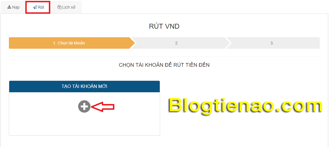 Bước 1: Vào “Ví VNĐ” trên thanh Menu => click vào “Rút” => tiếp tục click vào dấu “+” dưới phần tạo tài khoản mới.