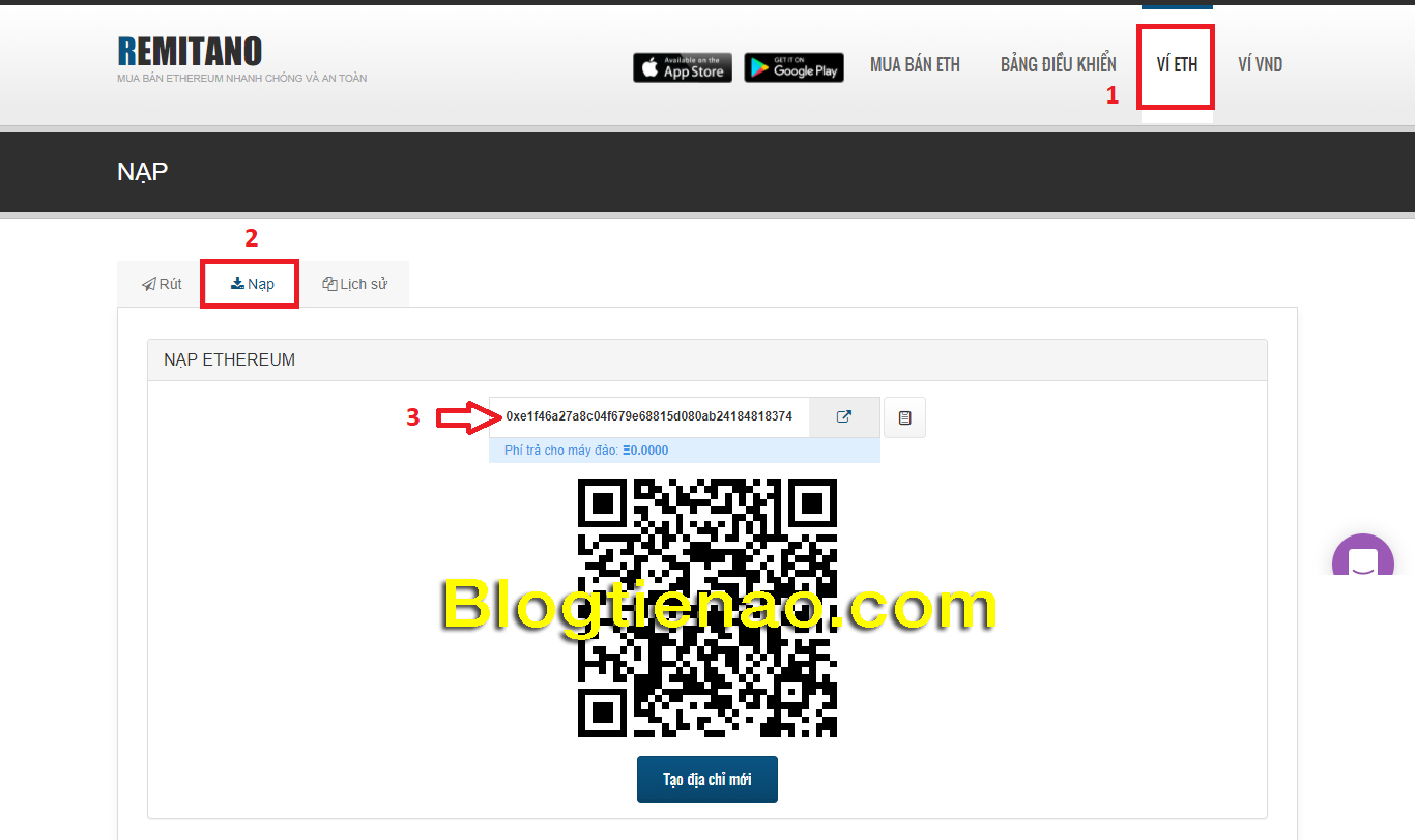 Để tạo ví ETH trên Remitano khá đơn giản, bạn vào “ví ETH” trên menu => click vào “Nạp” => dãy ký tự và số trong khung chính là địa chỉ ví Ethereum của bạn trên Remitano. Khi muốn bán ETH bạn cần chuyển ETH vào ví này để Remitano giữ ETH cho bạn.