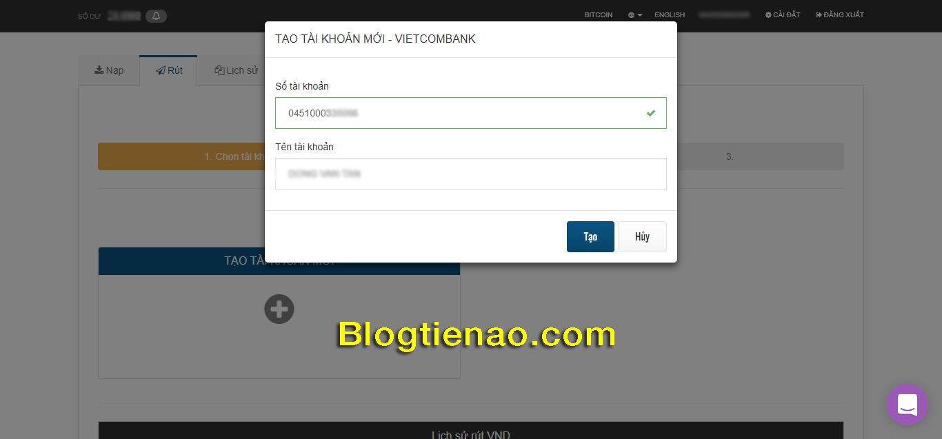 Tạo ví VNĐ trên RemitanoBước 2: Điền số tài khoản Vietcombank của bạn vào, Remitano sẽ tự động tìm ra tên tài khoản của bạn, xong thì nhấn vào “Tạo”.