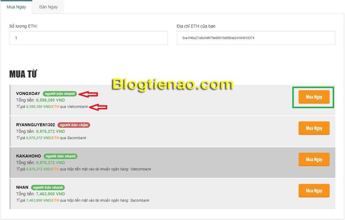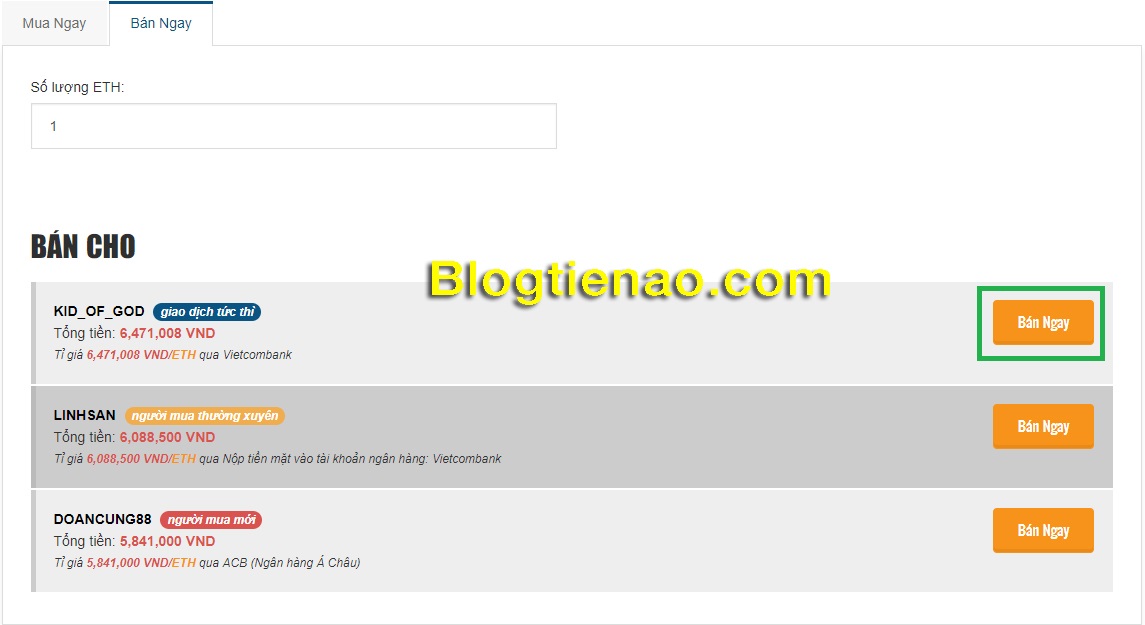 Bạn nên chọn “người bán nhanh” hoặc “người bán uy tín” để giao dịch nhanh nhất và phải chọn người chấp nhận thanh toán qua Vietcombank.