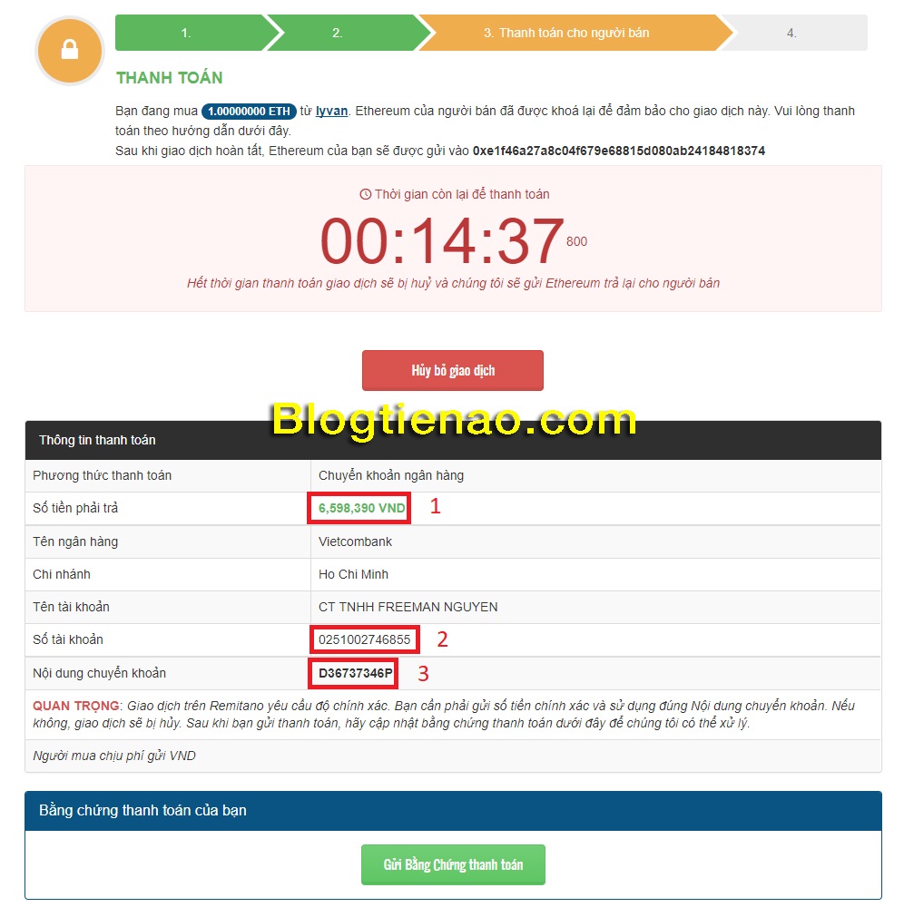 Chọn người bán EthereumBước 3: Thanh toán cho người bán: Bạn có 15 phút để thực hiện chuyển tiền cho người bán Ethereum theo thông tin mà Remitano cung cấp cho bạn. Bạn chú ý, vì sàn Remitano là một hệ thống tự động nên khi thực hiện giao dịch chuyển tiền bạn phải điền đúng các thông tin như: Số tài khoản, số tiền phải trả và nội dung chuyển tiền, để chắc chắn bạn copy và dán vào nhé.
