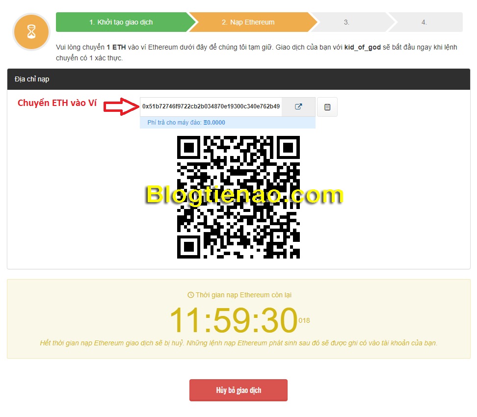 Bước 4: Sau khi nhấn “Tiếp tục” bạn sẽ có 12 phút để chuyển số Ethereum mà bạn muốn bán vào ví ETH của người mua, bạn truy cập vào ví Ethereum của bạn và thực hiện chuyển ETH vào địa chỉ ví mà Remitano cung cấp như hình dưới.