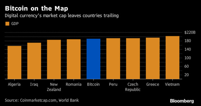 Nền kinh tế New Zealand hiện đạt giá trị 185 tỷ USD theo tính toán của World Bank – tức là ít hơn 5 tỷ USD so với giá trị thị trường của bitcoin. Vốn hóa thị trường của loại tiền tệ này cũng lớn hơn nhiều quốc gia gồm cả Qatar, Kuwait và Hungary.