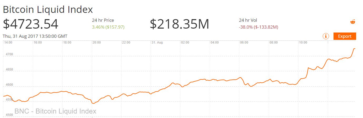 Giá bitcoin đã vượt qua bức tường $ 4,600 vào hôm thứ ba nhưng trong 48h qua, hầu như chỉ dao động quanh mức $ 4500. Sáng thứ Năm, nó bắt đầu tăng, vượt qua $ 4,600 một lần nữa. Tại thời điểm chúng tôi thực hiện bài viết này, giá bitcoin đã tăng lên mức cao nhất trong lịch sử 4.723 đô la, dẫn đến thị phần vượt ngưỡng 77 tỷ đô la.