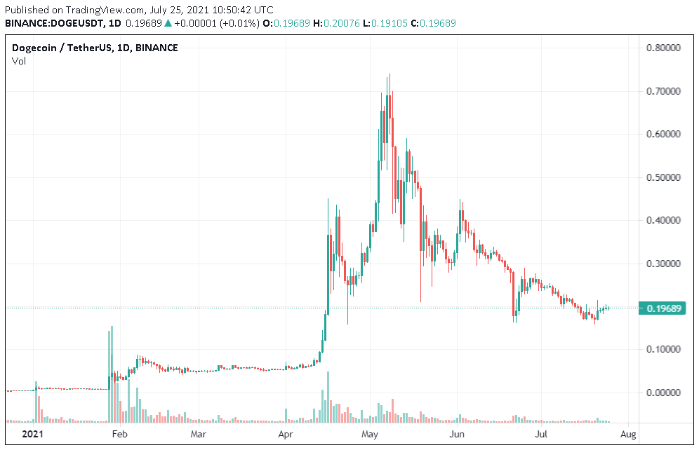 Musk và những người nổi tiếng khác đã tiếp tục thúc đẩy Dogecoin sau đó, cho đến khi nó đạt mức cao nhất mọi thời đại là 0,74 đô la vào giữa tháng 5.
