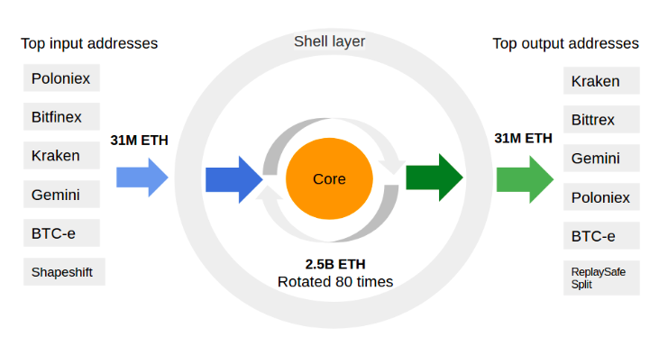 Trên cyberFund blog, bài phân tích chỉ ra rằng một máy trộn Ethereum đang cố gắng chuyển tiền vào các địa chỉ tạm thời, trộn chúng từ địa chỉ này sang địa chỉ khác, sau đó đưa chúng vào các địa chỉ cố định hơn trên các sàn giao dịch khác. Hình dưới đây thể hiện rõ quá trình này: