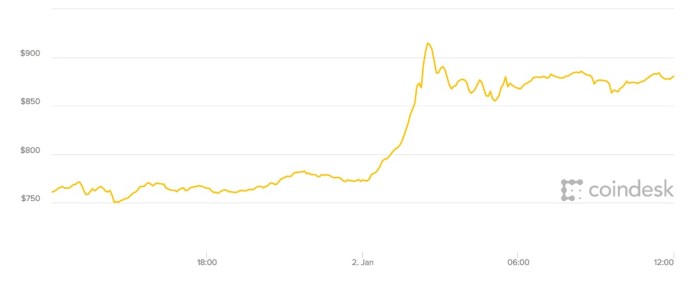 Tuy nhiên, hôm nay ngày 02/01/2018 Ethereum đã bất ngờ phá đỉnh ở mức 900 USD. Khối lượng giao dịch Ethereum trên các sàn giao dịch cũng tăng dần, khiến cho giá của đồng tiền số này đã tăng dần, Theo CoinDesk mức giá cao nhất được ghi nhận là 914.83 USD lúc 02:30 ( UTC ).