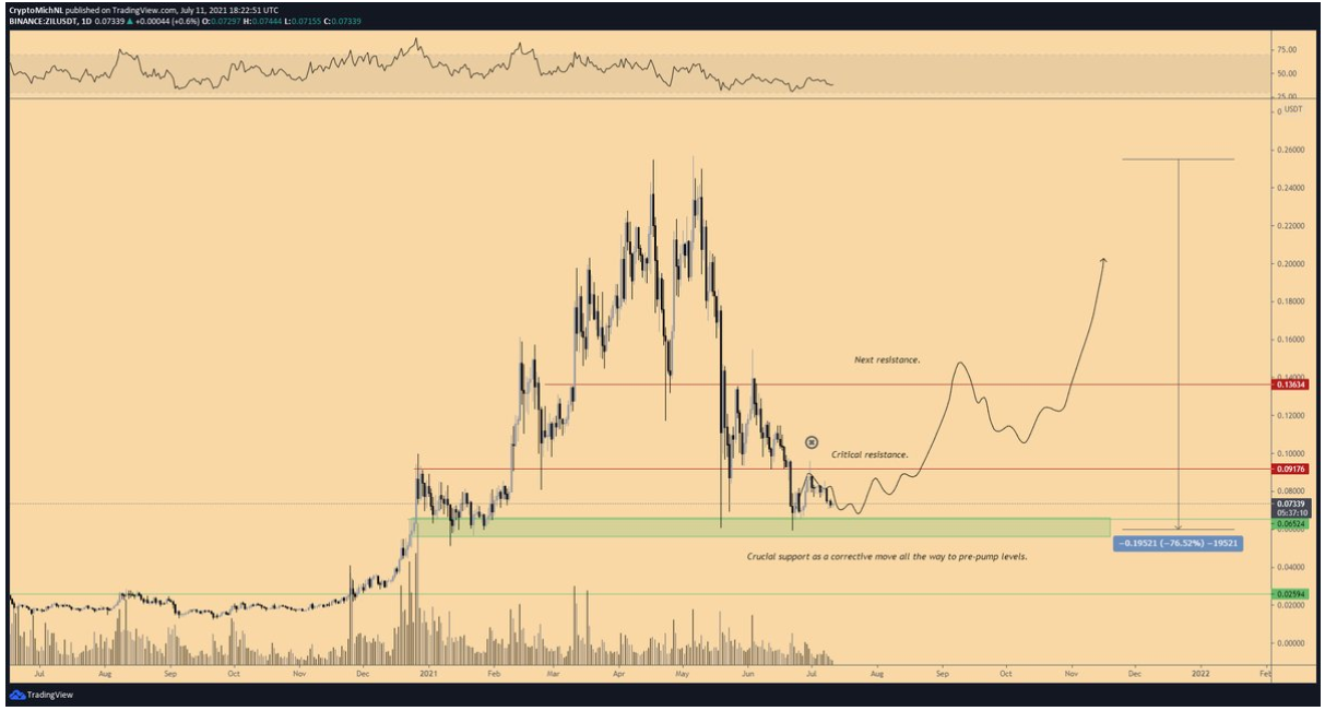 Đồng tiền cuối cùng trên radar của Van de Poppe là Zilliqa (ZIL). Nhà phân tích cho biết anh hy vọng ZIL sẽ chạm mức hỗ trợ quan trọng ở $ 0,06 một lần nữa trước khi bắt đầu một đợt tăng 233% lên mục tiêu của anh là $ 0,20.